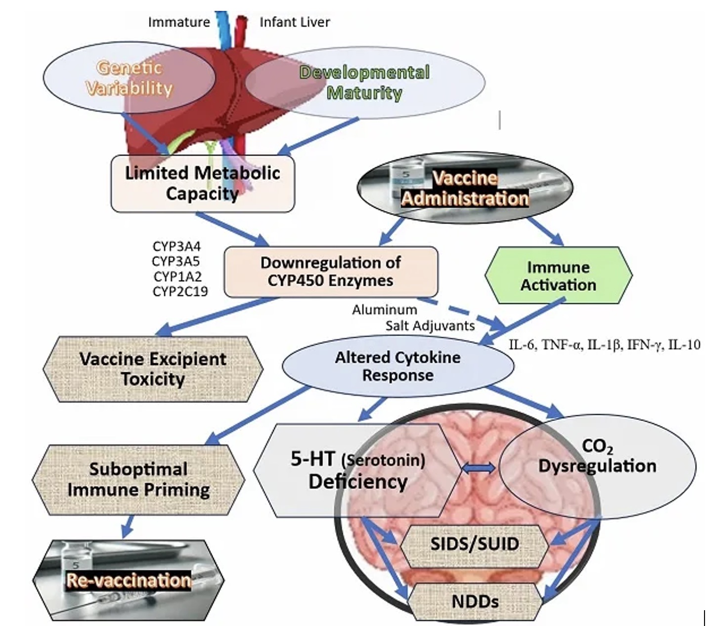 VLA Comment: Toxigenic xenobiotics included in vaccines, in trace amounts, given to neonates, infants and children for the first 3 years of their lives have not been studied for their elimination and detoxification. Research is widely established on the fact that Cyp 450 is immature in neonates, infants and children under 3. Cyp 450 doesn’t reach adult level until after 3 years old and some at 5 and 10 years old. If you add up a typical scenario (no delays, standard brands) by age ~2-3 years, the number of shots/doses is likely in the 20–30 injections range (counting multiple doses of each series)…that is an accumulation of 20-30 times of Trace amounts of toxigenic xenobiotics like Polysorbate 80, formaldehyde, glycerol, See vaccine excipient chart highlight for xenobiotics: Vaccine-excipients-HIGHLIGHTED-3