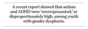 Excerpt: A pair of studies conducted in 2016 and 2019 indicate that autistic children are between four and seven times more likely to experience gender dysphoria or gender variance, he said. A 2019 was conducted by researchers at the Uniformed Services University of the Health Sciences, and a 2016 study was conducted at New York University.
